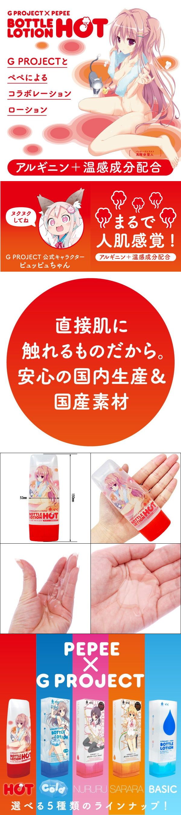 まるで人肌感覚。 人気シリーズG PROJECTとぺぺによるコラボレーションローション第5段。ほんわりあたたかアルギニン 温感成分配合のHOTローションです。温感ローション特有のベタつきを極力抑え、人肌が恋しい時や寒い冬にも、年中お楽しみいただけます。直接肌に触れるものだから、国産素材・国内生産を使用しております。パッケージイラスト:高階@聖人