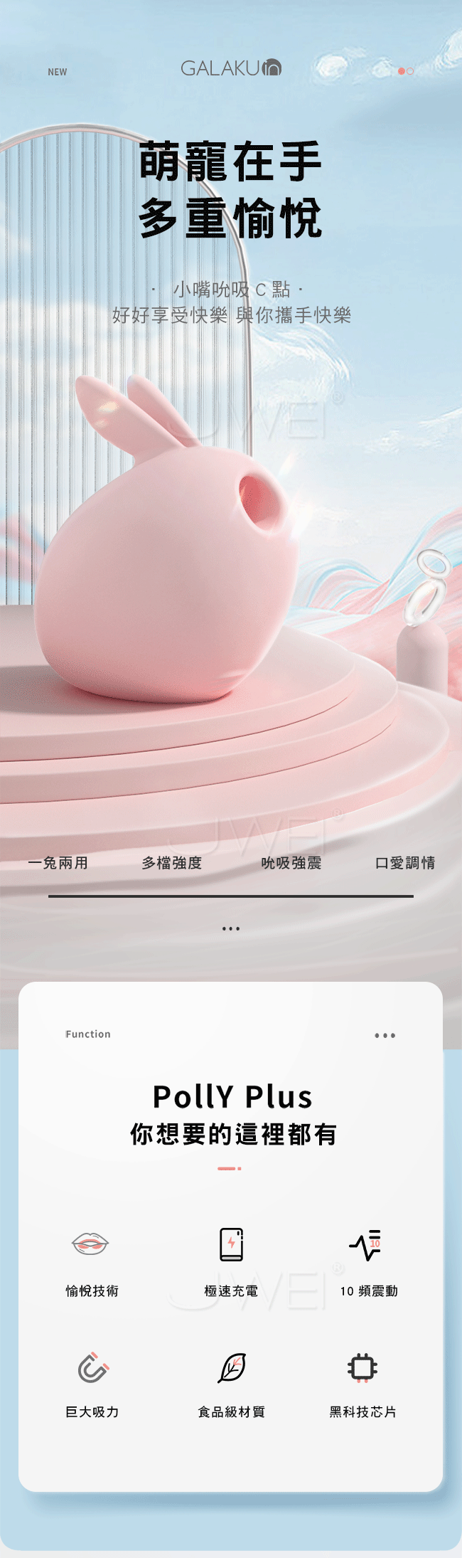 萌寵在手多重愉悅,嘴部精準包裹逗豆,喚醒豆豆深處8000條敏感神經~女生的小豆豆富含敏感神經,羞羞噠小惡魔的吮吸口正是為它而生,小嘴緊緊包裹豆豆,靈活又有勁兒。一體成型甚至可以邊洗澡邊使用喔~