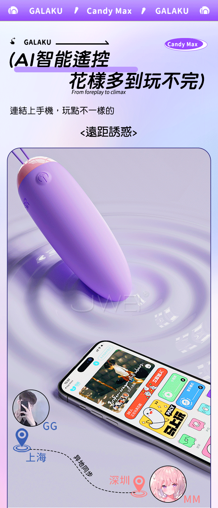 ►您現在的位置:首頁>GALAKU.跳跳糖 10頻爆跳穿透強震 深肌快感 加厚矽膠變頻跳蛋【AI智控款-紫色】