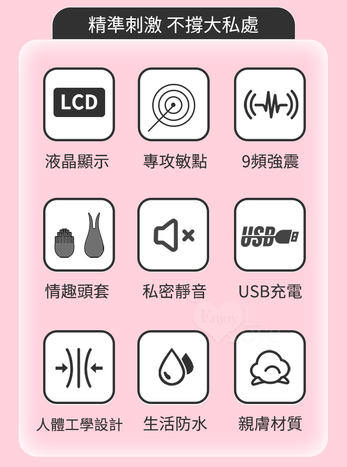 主要功能:9頻聲波高頻震動,液晶顯示刺激12,000根神經,雙頭套帶來多種花樣玩法