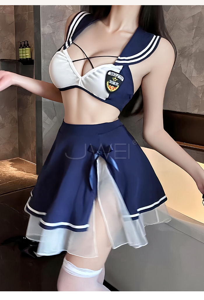 ►您現在的位置:首頁>甜心刑警.胸前交叉繫帶清純百褶透視白紗COS制服套裝【上衣+短裙-藍+白】