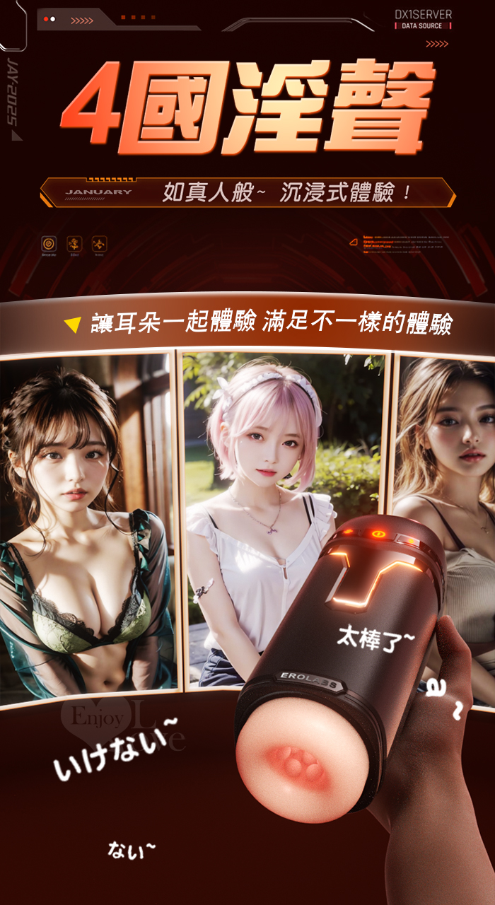 EROLABS 擼霸全配版 ‧ 智能伸縮/吸吮/震動/語音 緊實肉感自慰鍛練杯﹝液晶數碼9頻伸縮X9頻吸吮X9強震+4國淫聲+耳機﹞黑色